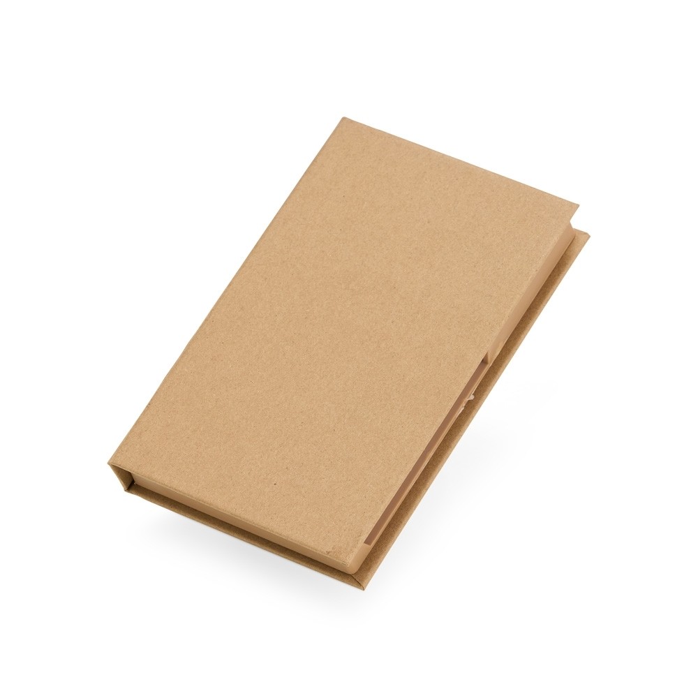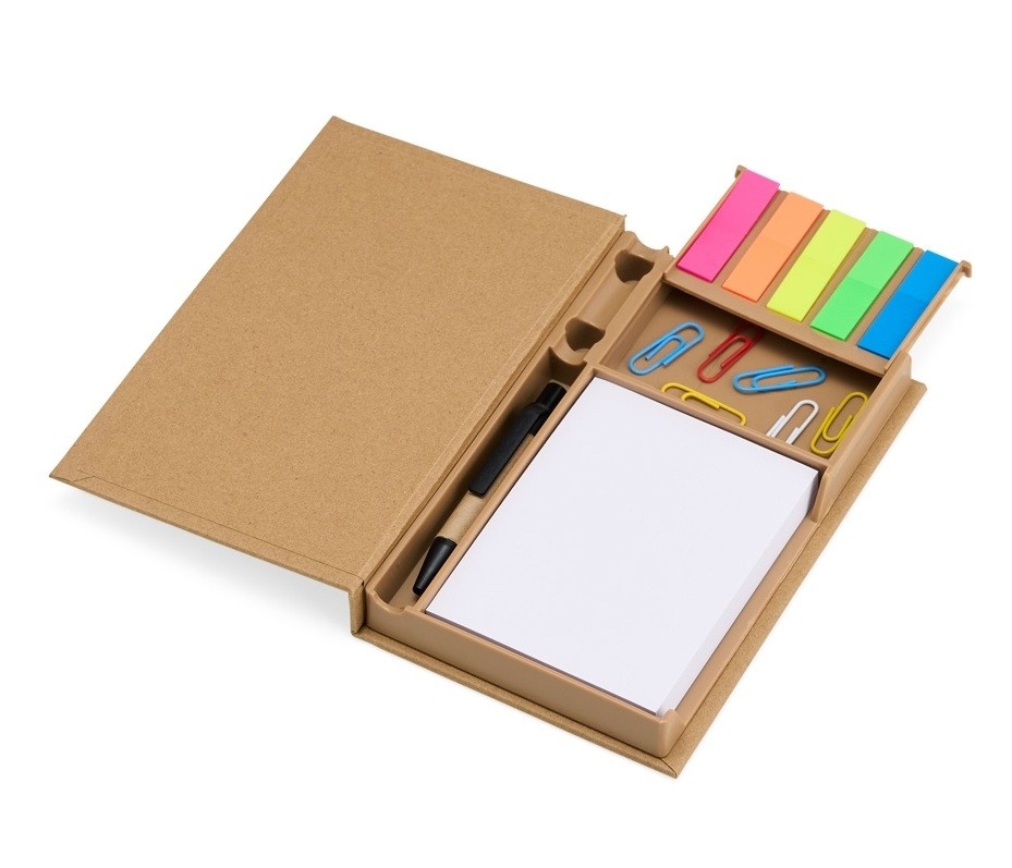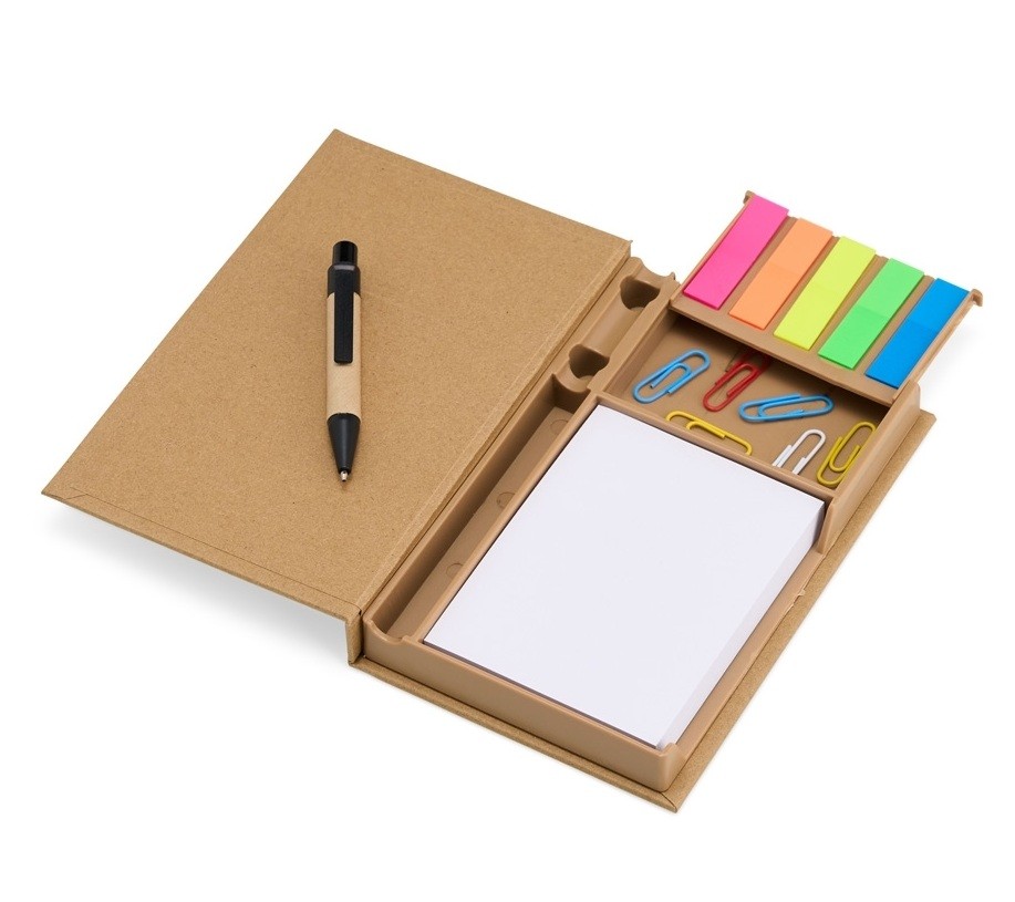 Bloco feito de material kraft, com 100 folhas brancas, 5 marcadores autoadesivos coloridos, 7 clips guardados em uma gavetinha e uma mini caneta de papelão com carga esferográfica azul. Ainda conta com espaço para armazenar a caneta e dois suportes porta-caneta. Personalização em 1 face do bloco. Medidas aproximadas: Altura: 16,3cm | Largura: 10,6 cm | Espessura: 2,1cm | Peso: 191g