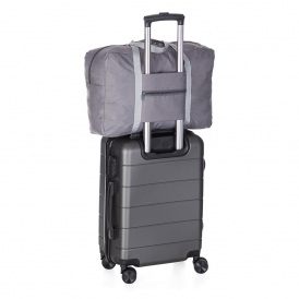 Bolsa de viagem dobrável 24 litros em poliéster impermeável com dois compartimentos. Contém bolso para encaixe em malas de viagem. Personalização colorida em uma face. Medidas aproximadas: Altura: 32cm | Largura: 48cm | Profundidade: 16cm | Peso: 123g.