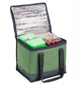Bolsa térmica de poliéster com capacidade de 12 Litros. Contém alça de mão em nylon. Personalização colorida em 1 face. Medidas aproximadas: Altura: 24cm | Largura: 20cm | Profundidade: 27cm | Peso: 193g