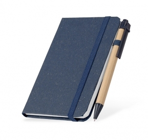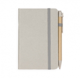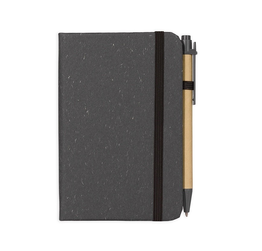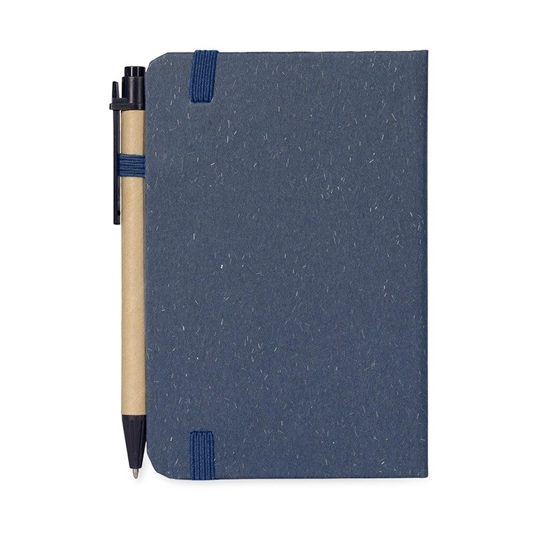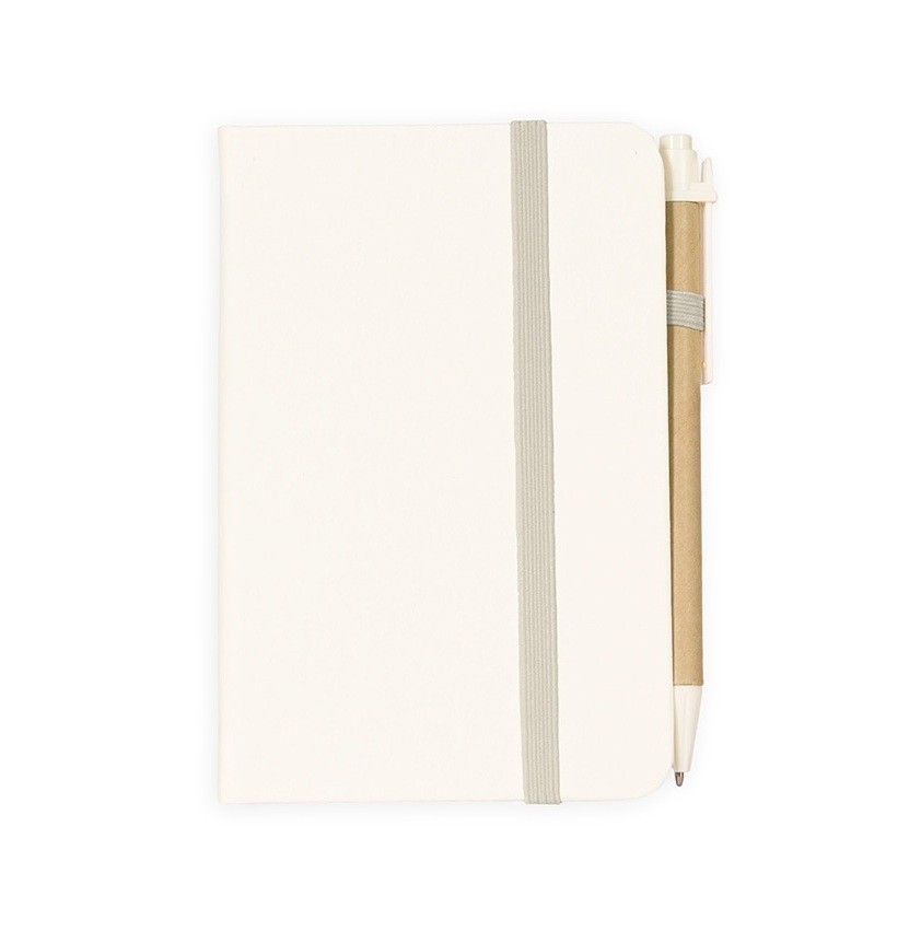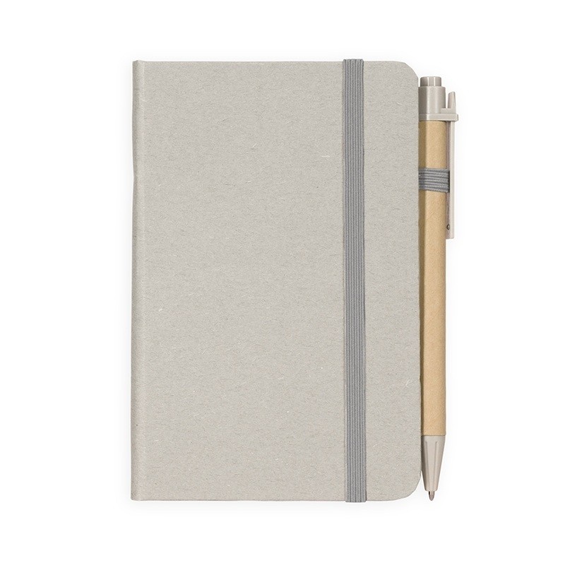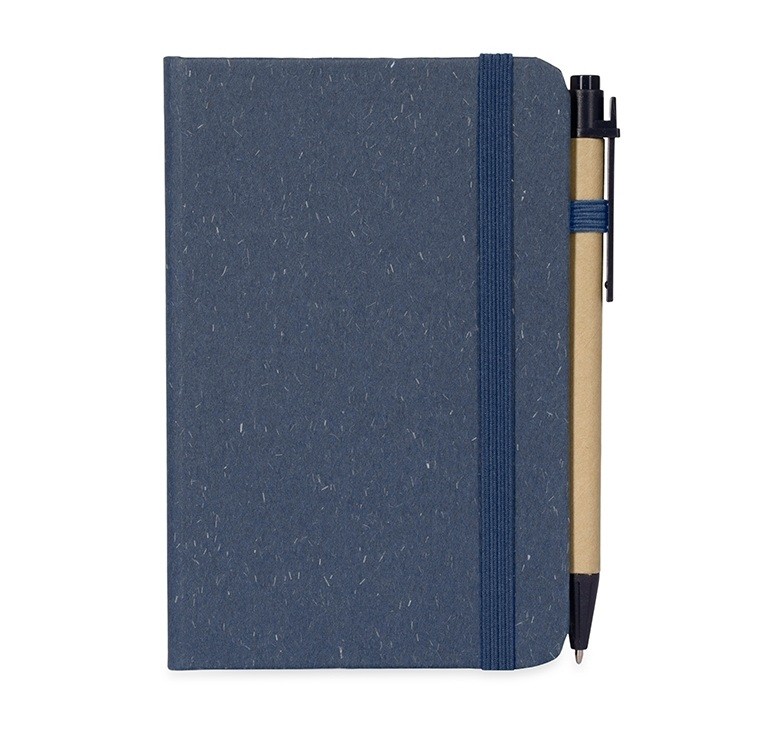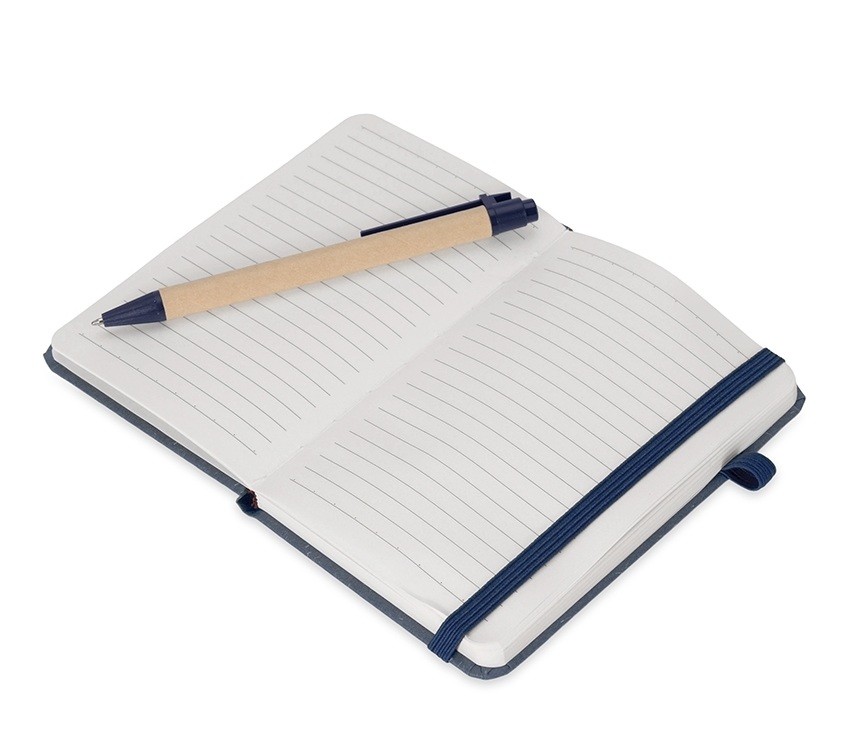 Caderneta ecológica de capa dura revestida em fibra de palha de trigo. Contém aproximadamente 80 folhas brancas com pauta, uma fita para fechamento e porta-canetas elástico. Acompanha uma caneta esferográfica de carga azul. Personalização colorida em 1 face e na caneta. Medidas aproximadas: Comprimento: 14cm | Largura: 9,3cm | Espessura: 1,3cm | Peso: 107g.