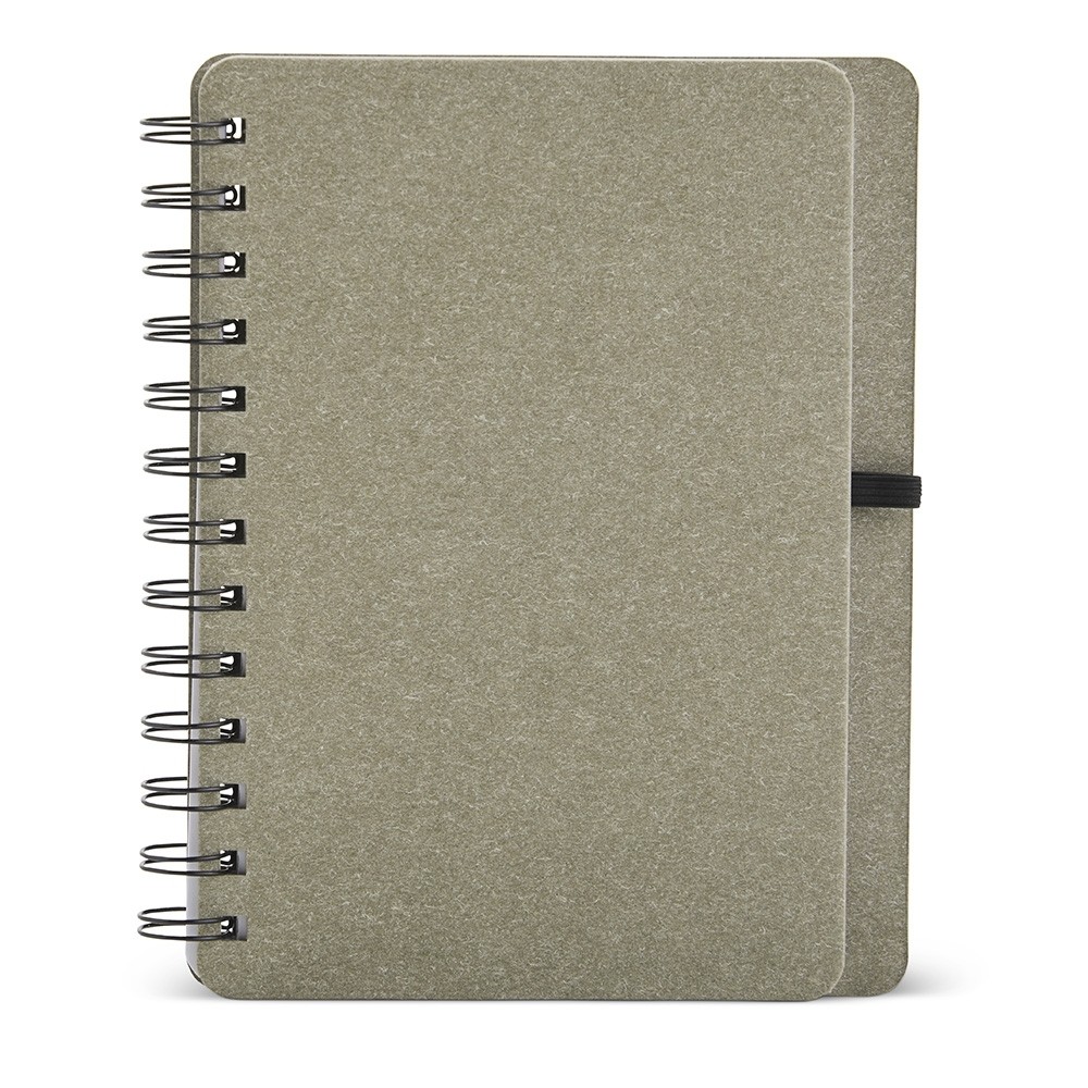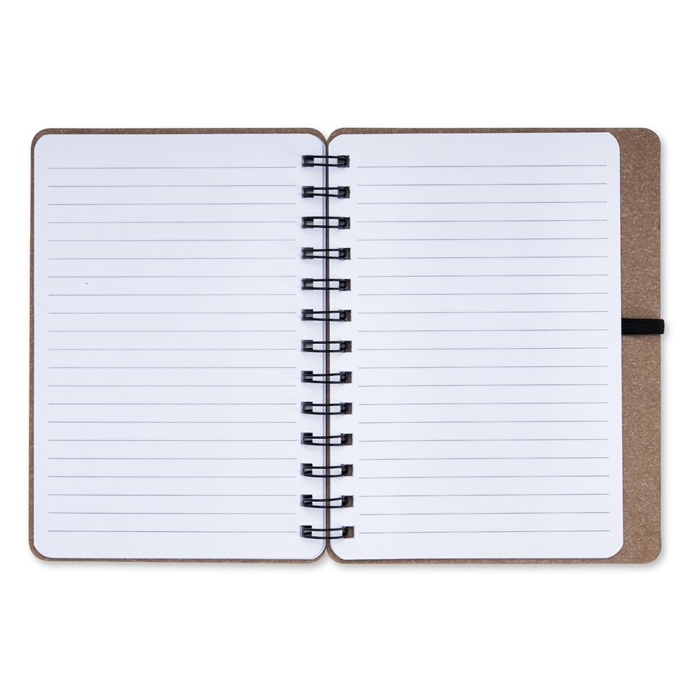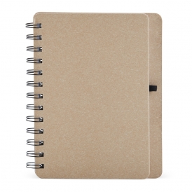 Caderno B6 capa dura em kraft com wire-o e porta caneta. Contém aproximadamente 70 páginas pautadas na cor branca. Personalização colorida em uma face. Medidas aproximadas: Altura: 17,5cm | Largura: 13,5 cm | Espessura: 1,5cm | Peso: 162g