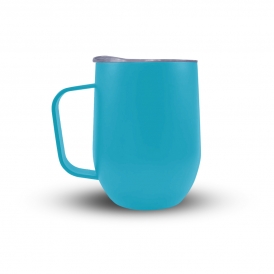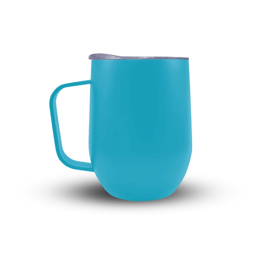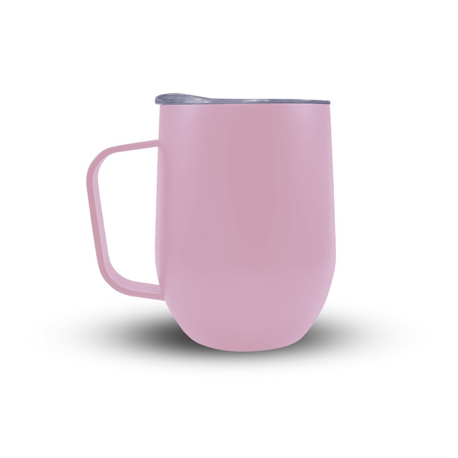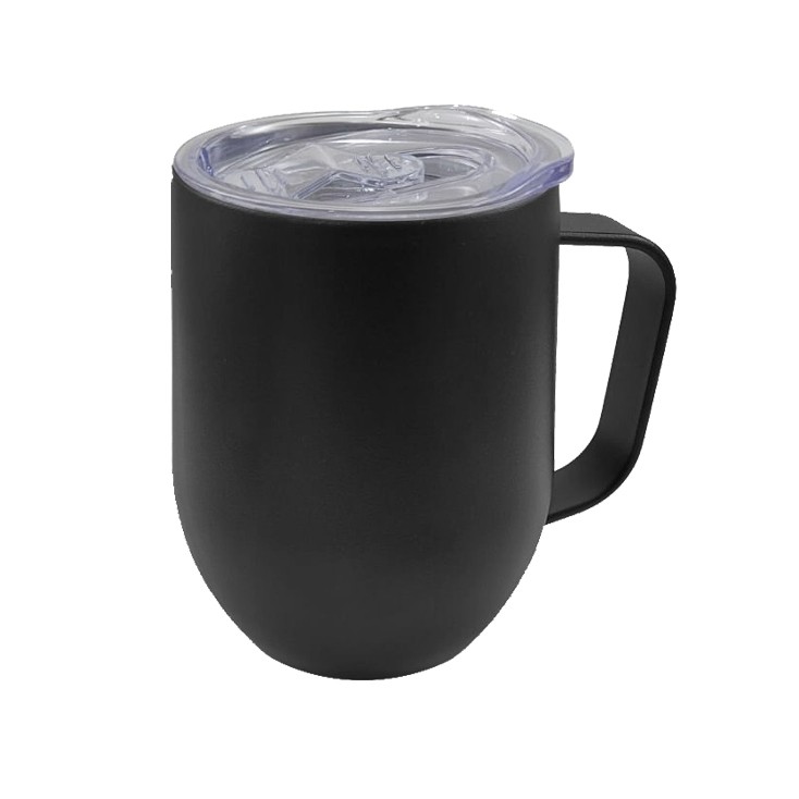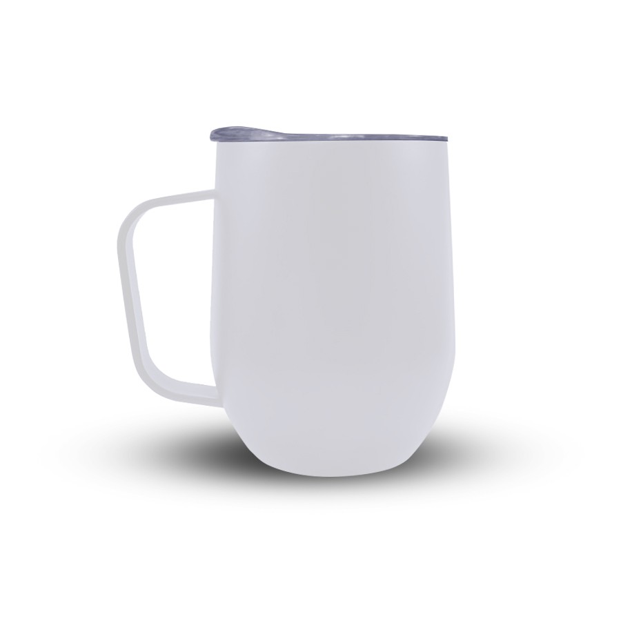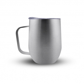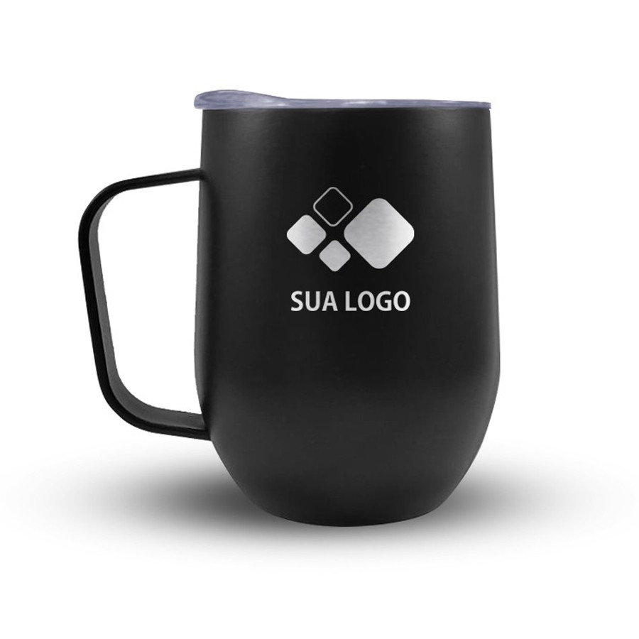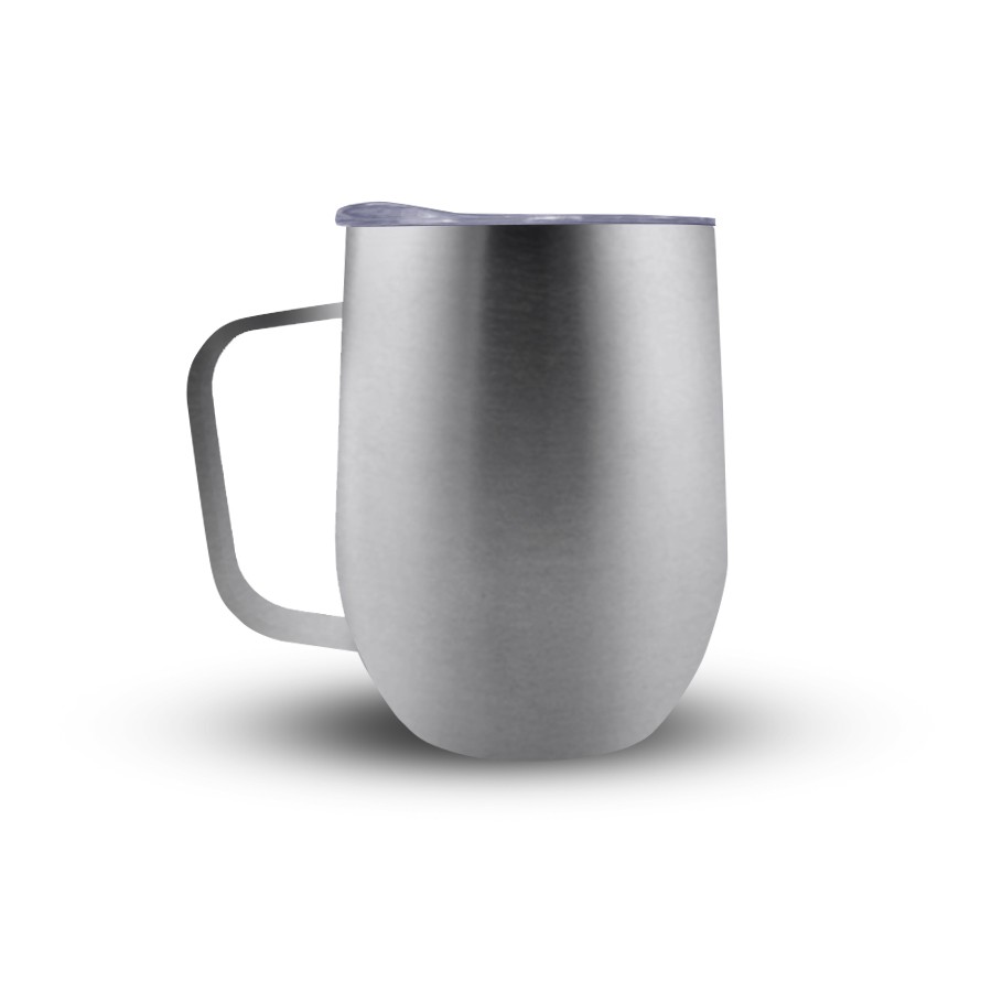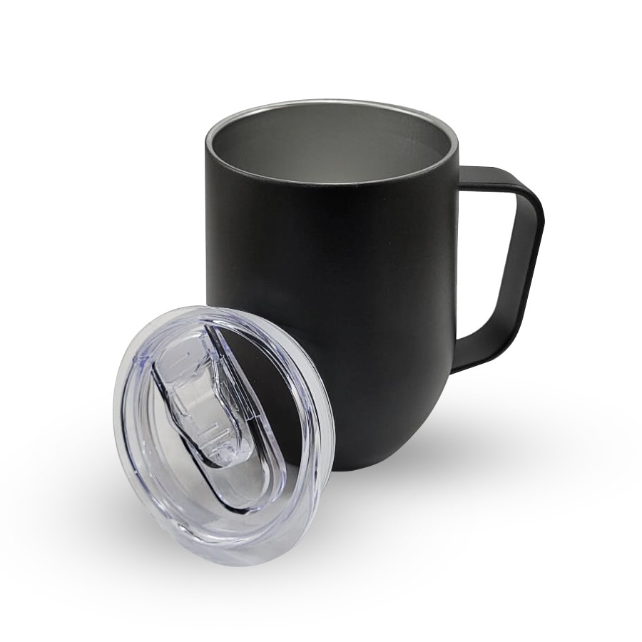 Caneca 350ml parede dupla em Inox, com pegador de inox, contém tampa transparente com compartimento para beber. Personalização feita por sublimação térmica ou laser nas duas faces.