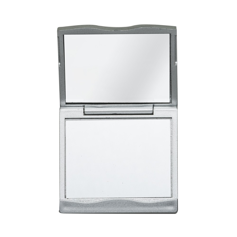 Espelho plástico duplo com aumento. Tamanho: 6,5x5,3cm. Personalização laser ou silk screen 1 cor em 1 face.