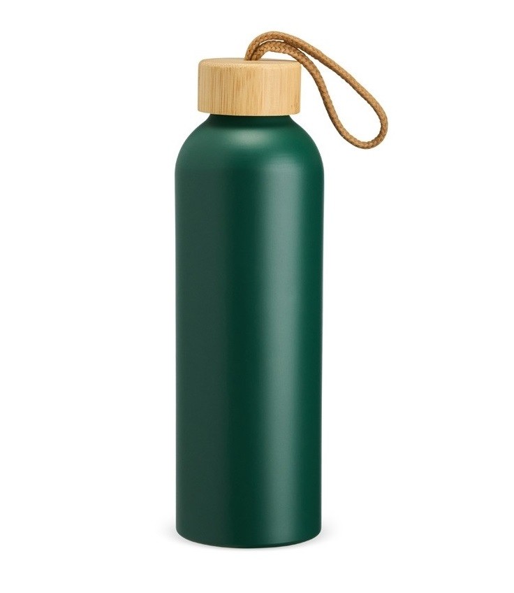 Garrafa de alumínio com capacidade de até 800ml, tampa rosqueável de bambu com alça de algodão para facilitar o transporte. Personalização nas duas faces. Medidas aproximadas: Altura: 23,5cm | Largura: 7cm | Circunferência: 23cm | Peso: 111g