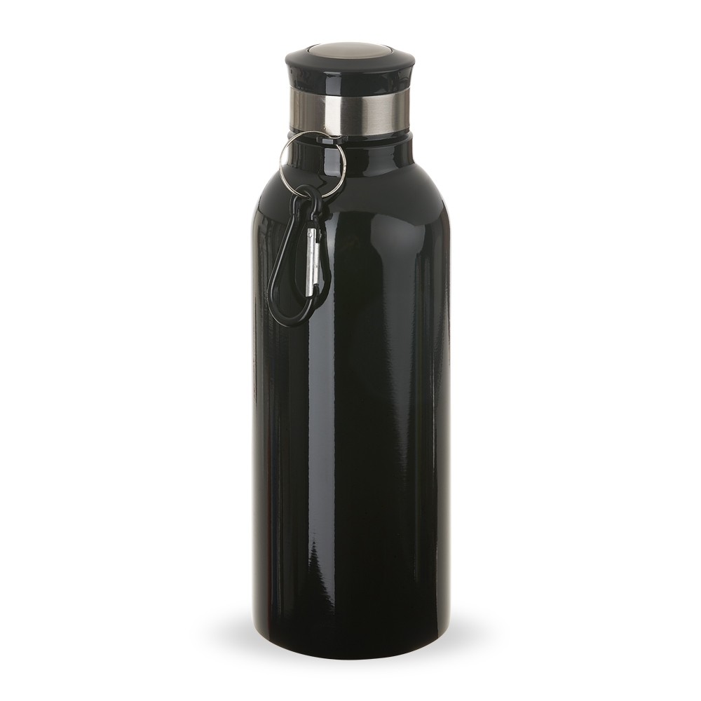 Garrafa Inox 700ml com pintura colorida e detalhes em prata. Possui tampa rosqueável e acompanha chaveiro mosquetão. Personalização nas duas faces. Medidas aproximadas: Altura: 21cm | Largura: 7,5cm | Circunferência: 23cm | Peso: 144g.