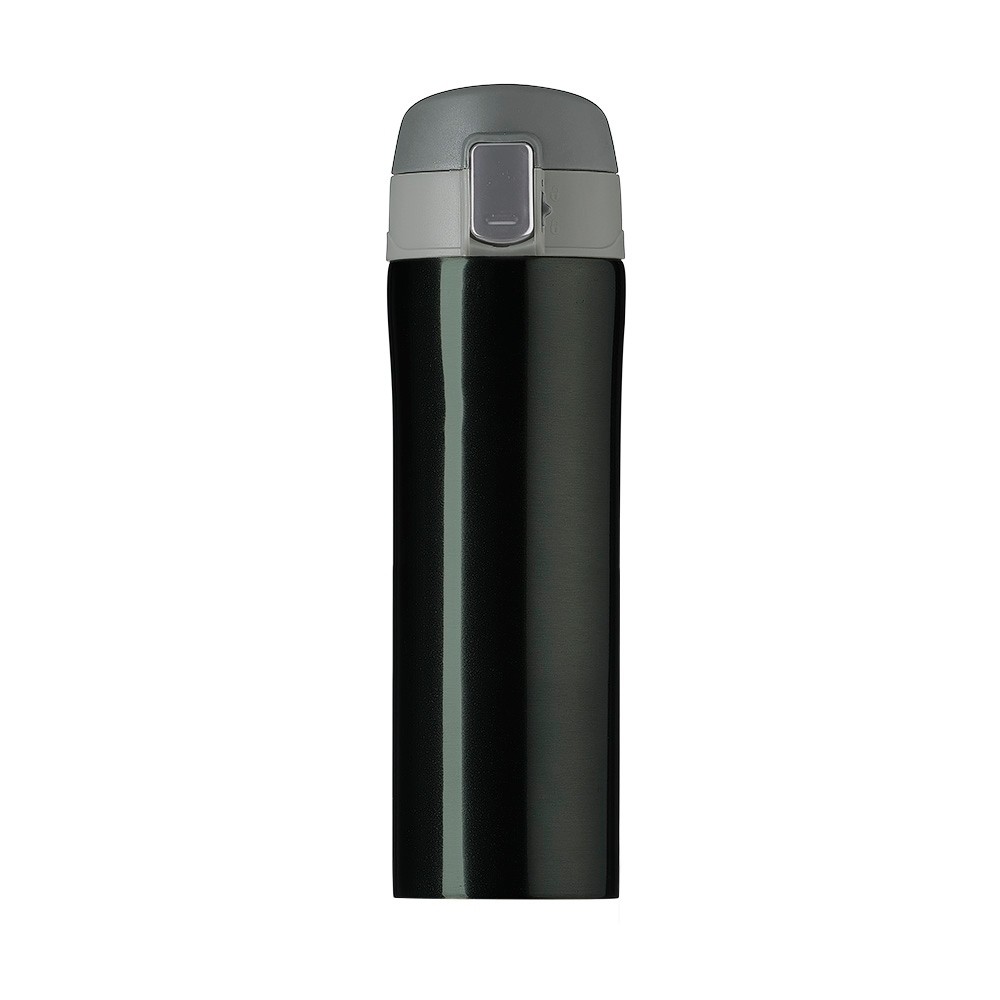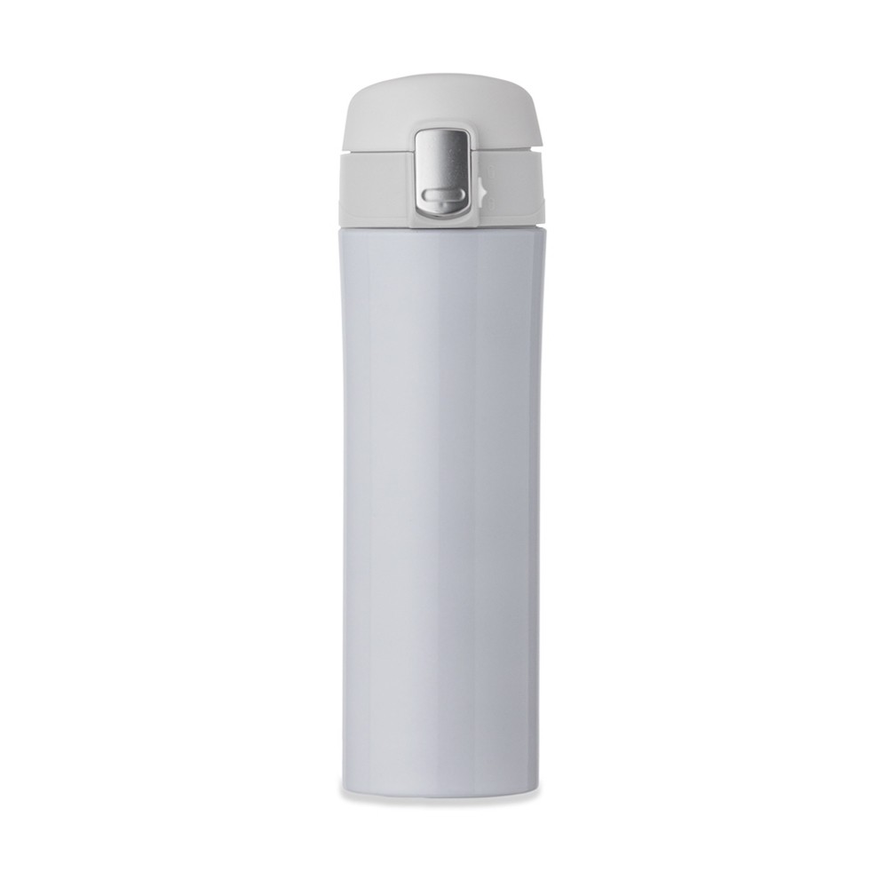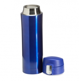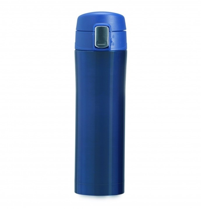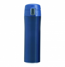 Garrafa térmica de 450ml de inox colorida com botão de abertura prata. Tampa com botão de acionamento e trava de segurança. Personalização nas duas faces. Medidas aproximadas: Altura: 23,9cm | Largura: 7,4cm | Circunferência: 21cm | Peso: 271g