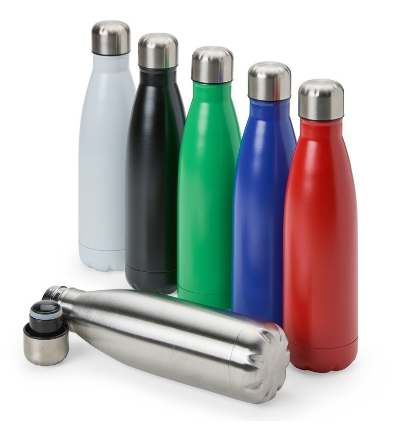 Garrafa térmica com tampa inox com capacidade de até 500ml. Personalização nas duas faces. Medidas aproximadas: Altura: 26,5cm | Largura: 6,5cm | Peso: 272g