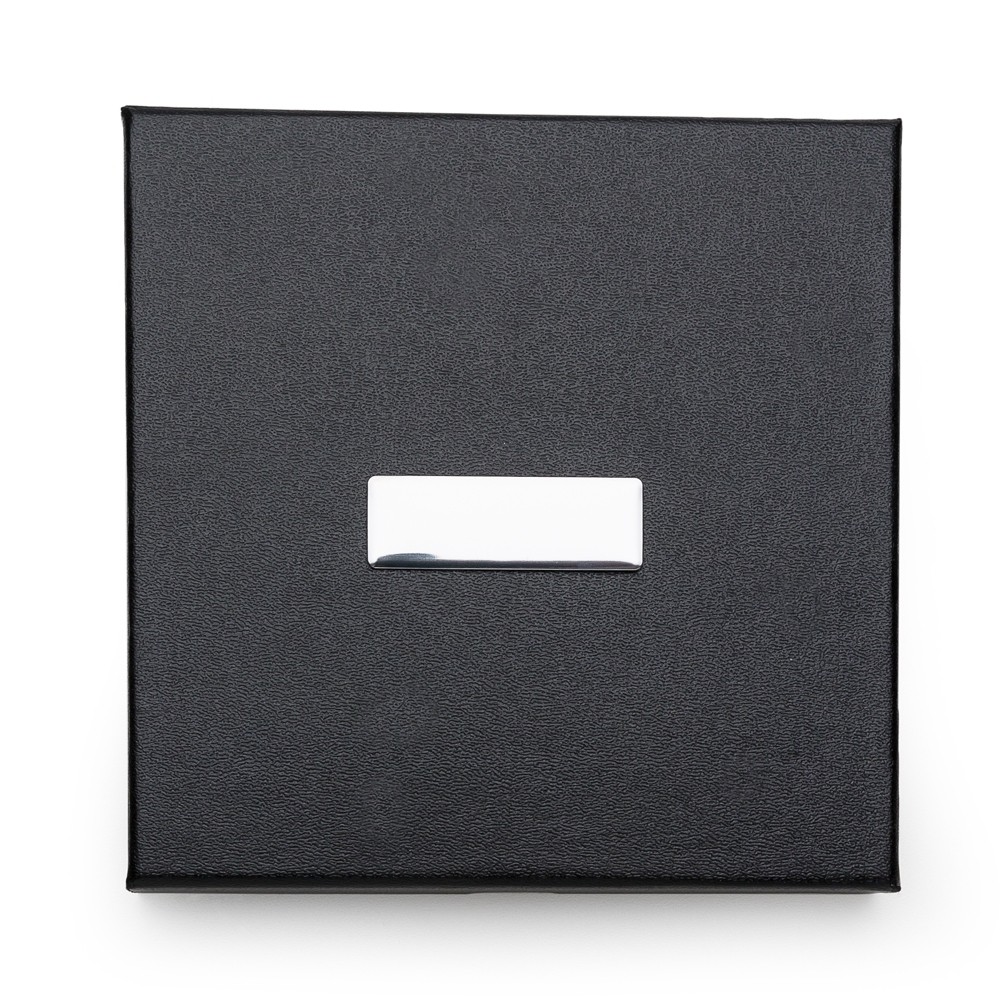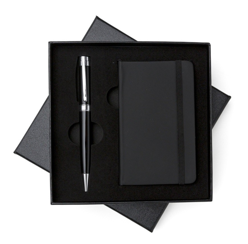 Kit executivo 2 peças em estojo de papelão com tampa e parte interna revestida de espuma. Contém: caneta metal preta com anel, detalhes em prata e escrita preta; caderneta emborrachada com aproximadamente 80 folhas amarelas com pauta. Personalização em uma face de cada peça. Medidas do estojo: Altura: 17cm | Largura: 17cm | Peso: 235g