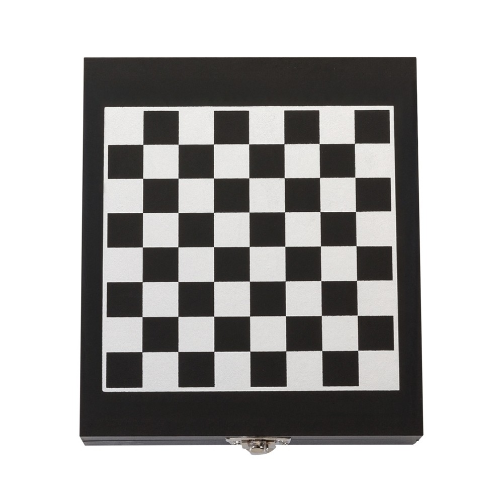 Kit vinho 4 peças em estojo tabuleiro de xadrez. Contém wine collar, tampa de bico, bico condutor com tampa e saca-rolhas metálico com lâmina de corte e abridor de garrafa. Estojo com trava de segurança e área interna com berço de espuma, acompanham 32 peças de xadrez. Personalização em 1 face. Medidas aproximadas: Largura: 14,2cm | Comprimento: 16,2cm | Peso: 4876g
