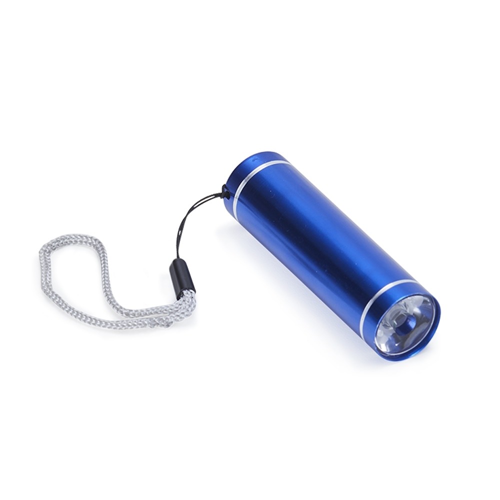 Lanterna de alumínio com 1 led e botão de acionamento emborrachado, acompanha cordão de nylon para transporte. Alimentada por 3 pilhas AAA (NÃO INCLUSAS). Medidas Aproximadas: Largura: 2,4cm | Circunferência: 7,6cm | Comprimento: 8,6cm. Personalização laser em 1 face.