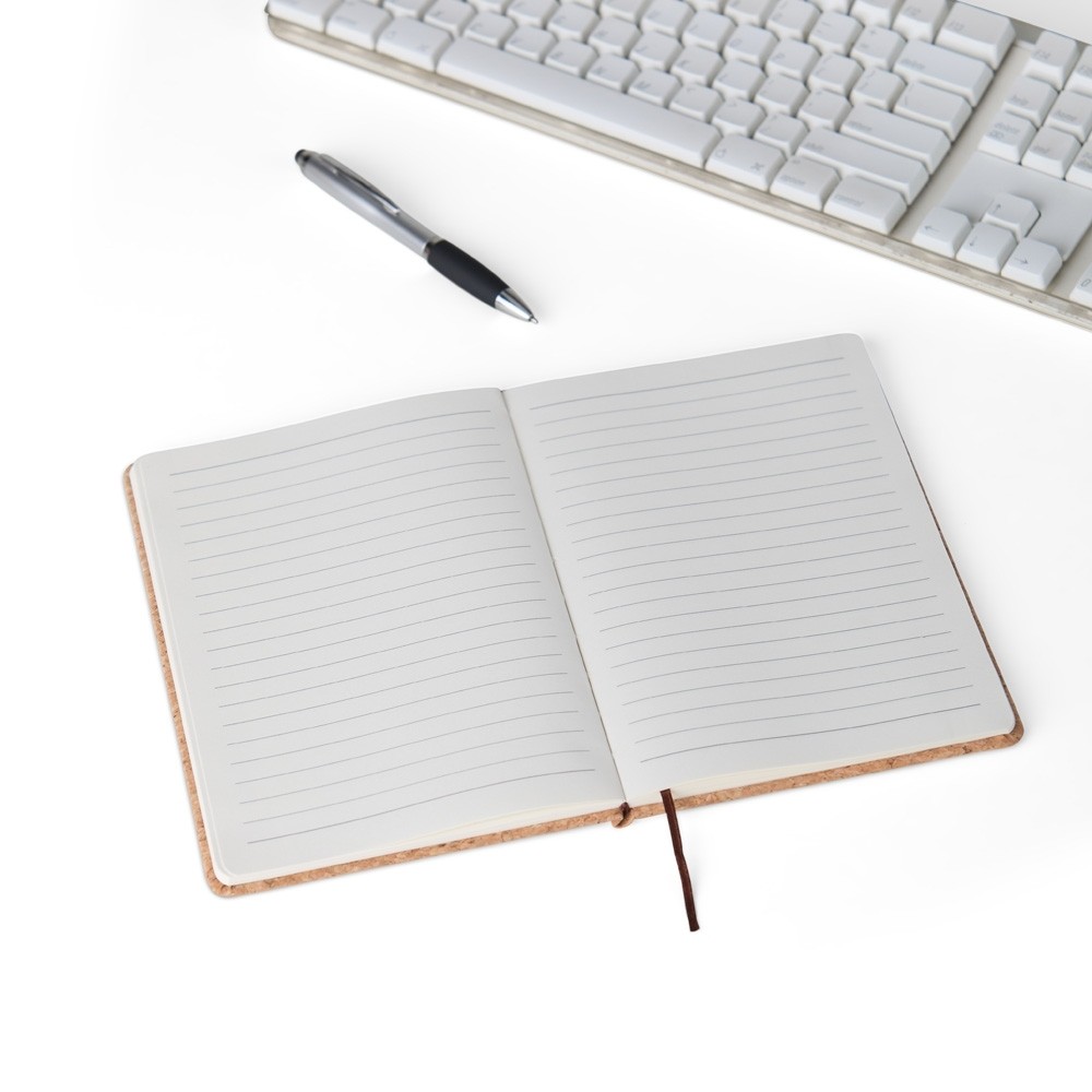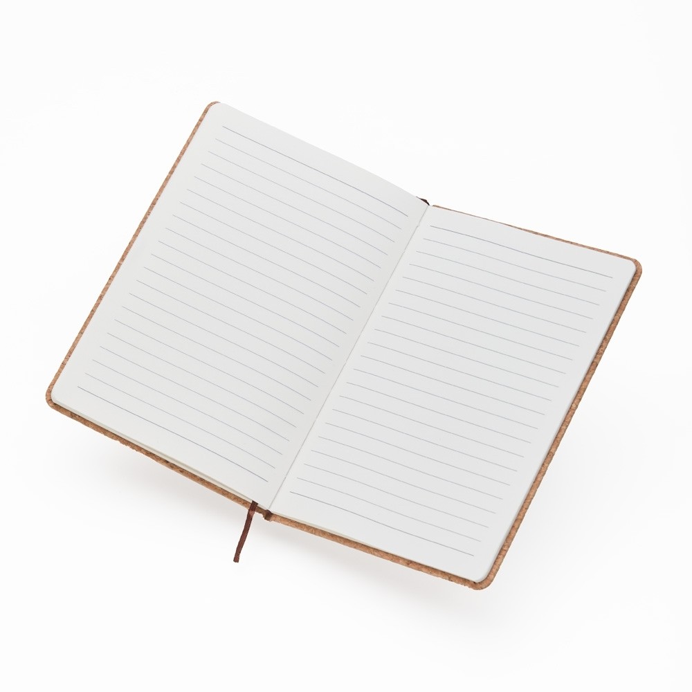 Moleskine em cortiça, contém aproximadamente 80 folhas amarelas com pauta, marcador de página em cetim e elástico para lacre. Dimensões: Altura: 21 cm | Largura: 14,5 cm | Espessura: 1,3 cm. Personalização DTF digital em 1 face.