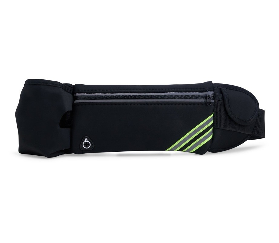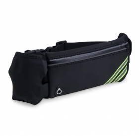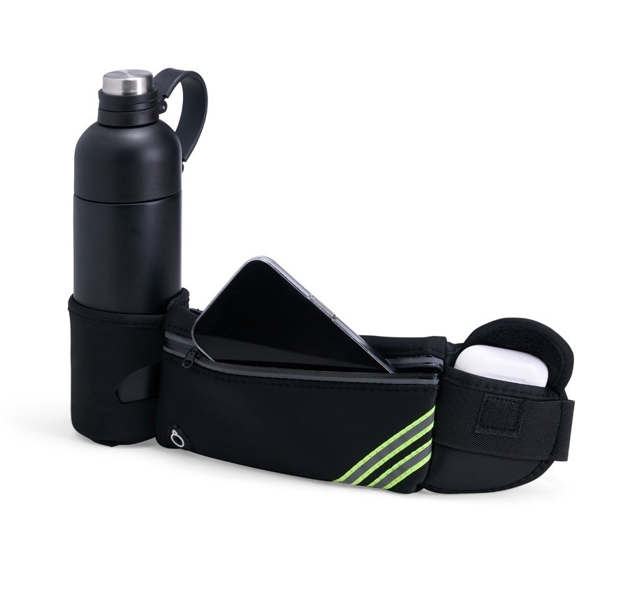 Pochete em neoprene e resistente à água, com bolso principal espaçoso e divisória interna. Na parte externa, conta com um compartimento para garrafa de água e um bolso menor para pequenos objetos. Possui saída para fones de ouvido e faixas refletivas. Personalização colorida em uma face. Medidas aproximadas: Altura: 9,4cm | Largura: 36cm | Comprimento: Alça: 31cm | Peso: 100g