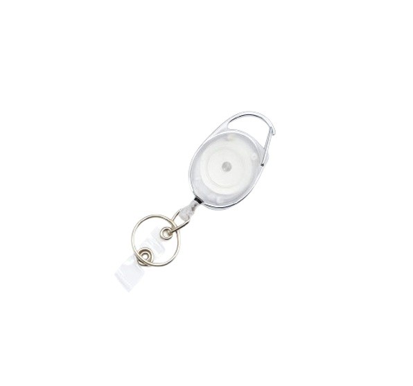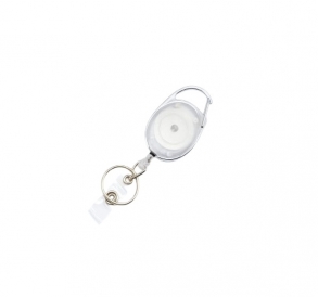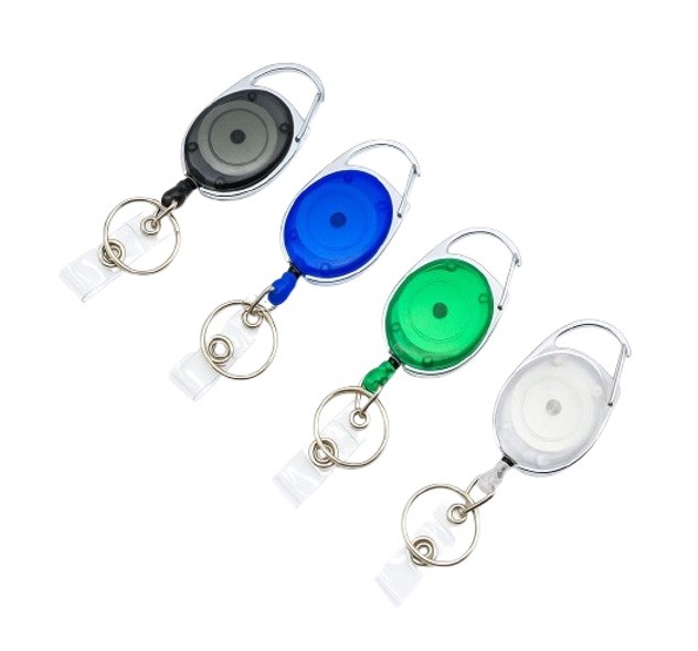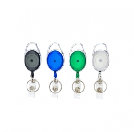 Porta crachá retrátil plástico, cores translúcidas. Roller clip possui sistema extensor em nylon que após puxar é recolhido automaticamente. Possui gancho na parte superior e alça plástica com botão. Personalização colorida em uma face.