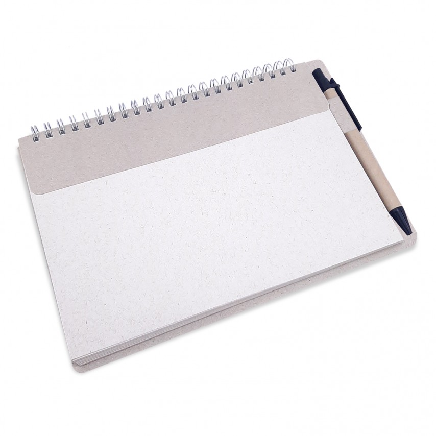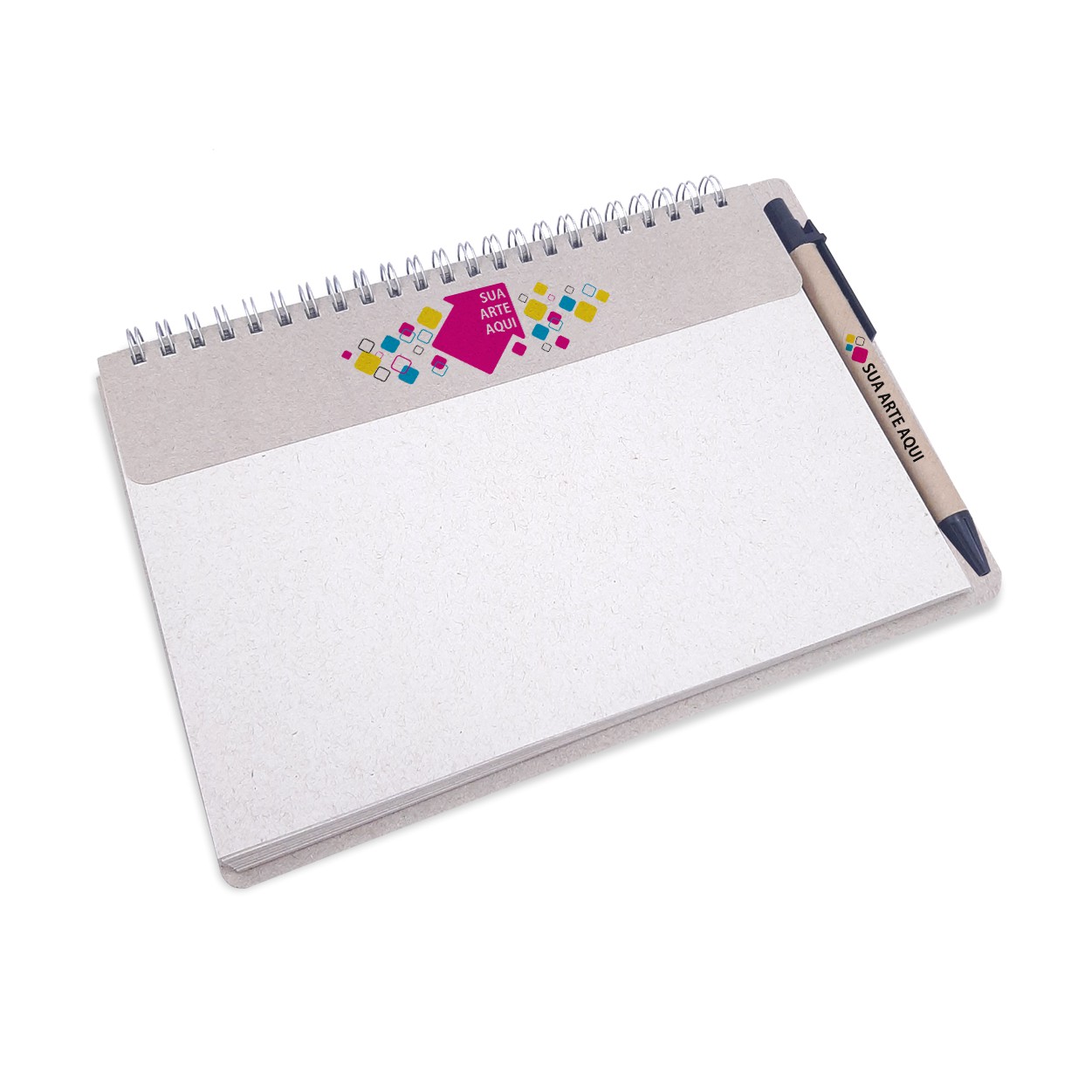 Risque e rabisque ecológico. Tamanho: 23x15,5cm, 80 folhas em papel reciclato 75g sem pauta, encadernação wire-o 1/2pol, aba personalizada em papel ASPEN 300g ou reciclato 240g, caneta ecológica personalizada.